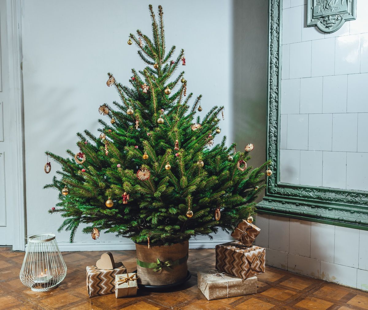 Часто в декоре используют природные элементы. Это подчеркивает красоту живых елок. Обратите внимание, как гармонично смотрятся натуральные материалы: